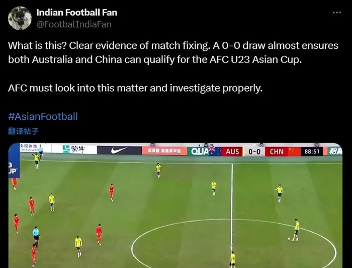 就在U23国足与澳大利亚出线以后,有些外国球迷就酸了,甚至不惜跑到亚足联战报的评论区留言“假球”举报。比如上图这位印度球迷就十分不满,直接配了张澳大利亚后场传球的生图宣泄心中的不满之情,原来印度和阿联酋都有6分,但因为净胜球缘故排名成绩最好第2中的第5位,最终遗憾出局。正因如此,“三哥”急了,开启了乱喷模式。